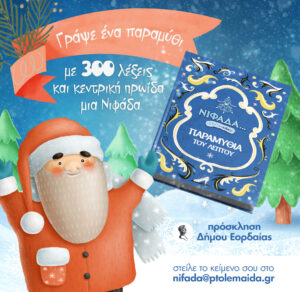 Αφήγηση ιστορίας μέσα από κείμενο 300 λέξεων το οποίο θα αποσταλεί, στην ηλεκτρονική διεύθυνση : nifada@ptolemaida.gr μέχρι 15-12-2020. Τα παραμύθια θα οπτικοποιηθούν και θα προβάλλονται όλη την εορταστική περίοδο στη σελίδα του Δήμου Εορδαίας, καθώς και στους λογαριασμούς των social medias (Facebook και Instagram) της Νιφάδας. Επίσης θα εκδοθούν σε βιβλίο, τα έσοδα του οποίου θα δοθούν για την ενίσχυση του Συλλόγου Γονέων, Κηδεμόνων και Φίλων ατόμων με αναπηρία Περιφέρειας Δυτικής Μακεδονίας.