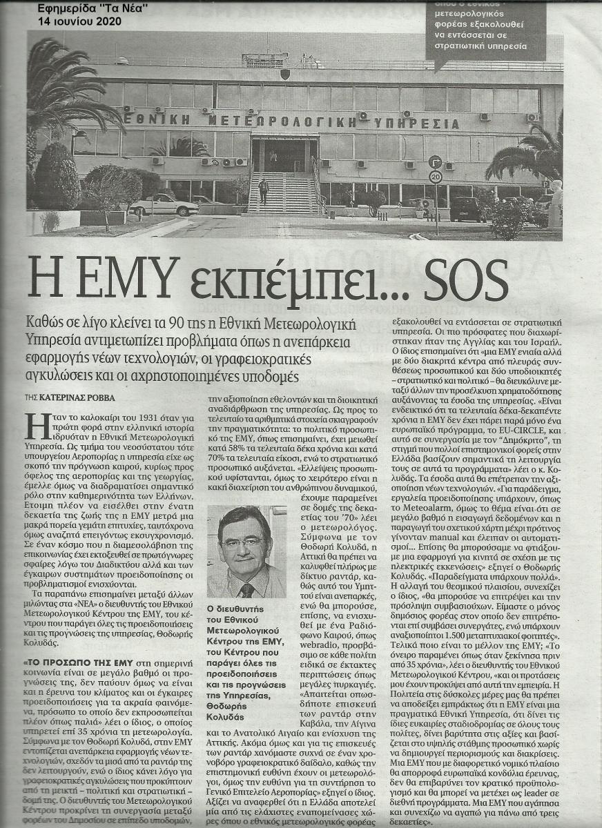 Με τον παρακάτω τίτλο η εφημερίδα “Τα Νέα” φιλοξένησε σήμερα την συνέντευξη που είχα δώσει πριν από λίγες ημέρες στη δημοσιογράφο κ. Κατερίνα Ροββά. Τους ευχαριστώ θερμά για την προβολή του θέματος , το οποίο αξίζει να σημειώσω αυτή την περίοδο συμπίπτει -όχι τυχαία- με τις αλλαγές που σχεδιάζονται να γίνουν στη δομή και στον ρόλο που καλείται να διαδραματίσει η ΕΜΥ στις σύγχρονες ανάγκες της κοινωνίας. Διαδικασίες οι οποίες είχαν ξεκινήσει από το 2014 και οι οποίες φέτος αναμένεται να ολοκληρωθούν.