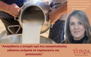 Ερώτηση προς τον Υπουργό Αγροτικής Ανάπτυξης και Τροφίμων κατέθεσαν 42 βουλευτές του ΣΥΡΙΖΑ – Προοδευτική Συμμαχία, με πρωτοβουλία της βουλευτού Καστοριάς και Αναπληρώτριας Τομεάρχη Αγροτικής Ανάπτυξης και Τροφίμων, Ολυμπίας Τελιγιορίδου, για την ανοιχτή τιμή στις αγοραπωλησίες γάλακτος ανάμεσα στους παραγωγούς και τους μεταποιητές. Στην ερώτηση, μεταξύ άλλων, τονίζεται η ανάγκη αναγραφής της τιμής στο συμφωνητικό εξ αρχής κι όχι στη συνέχεια ασκώντας πίεση στους παραγωγούς καθώς έχει δοθεί προκαταβολή και έχει δεσμευθεί η παραγωγή.