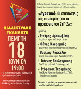 Διαδικτυακή εκδήλωση του Τμήματος Αγροτικής Πολιτικής ΣΥΡΙΖΑ και της ΕΠΕΚΕ, την Πέμπτη 17 Ιουνίου στις 19:00, με θέμα : “Αγροτικό: Οι επιπτώσεις της πανδημίας και οι προτάσεις του ΣΥΡΙΖΑ”.